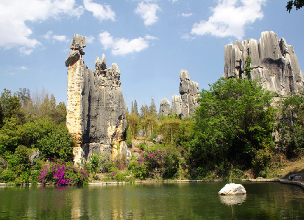 石林景区内的石林湖畔屹立着一座独立的石峰,只见那石峰宛似一位风姿绰约的少女,目视前方,似在眺望什么,仔细分辨之下,竟然还头缠包巾,背挎背篓呢,里面似有山茶花在开放,这不正是一位撒尼族少女吗!哦,原来她就是美丽的阿诗玛啊!传说中,阿诗玛化为石峰后,变成了回声神。从此,你怎样喊她,她就怎样回答你。她的声音,她的影子永远留在了人间。眼前的石峰就是阿诗玛的化身石了,她日夜远望着她的阿黑。