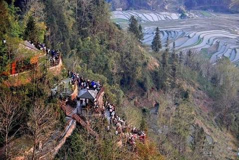 早餐后,乘车前往世界遗址----元阳哈尼梯田(主要有4大景区:坝达景区包括箐口、全福庄、麻栗寨、主鲁等连片14000多亩的梯田和箐口民俗村景区老虎嘴景区包括勐品、硐浦、阿勐控、保山寨等近6000亩梯田,多依树景区包括多依树、爱春、大瓦遮等连片上万亩梯田。如此众多的梯田,在茫茫森林的掩映中,在漫漫云海的覆盖下,构成了神奇壮丽的景观。这些景区就是目前准备申报世界遗产的核心保护区。)抵达后观胜村梯田(3公里、行车10分钟)